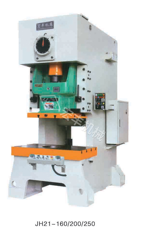 性能特點:*鋼板焊接機身,經過回火處理,剛性好,精度穩定。*A型機采用電磁調速電機調速,行程次數可調。*曲軸縱置,結構緊湊,曲軸經調質削磨處理,光潔度好,轉動靈活。*滑塊采用矩形六面導軌,導向精度高。*氣動雙平衡缸,平衡滑塊和上模重量,降低沖擊和噪音,消除連桿和滑塊間隙。*整機采用進口PLC集中控制,氣路選用進口安全雙聯閥控制,可實現點動,寸動,單次和連續沖壓,動作靈敏,安全可靠。*采用進口干式氣動摩擦離合器,可根據用戶要求,選配過載保護裝置或壓塌式保險器,自動潤滑,變頻調速等裝置。技術參數: